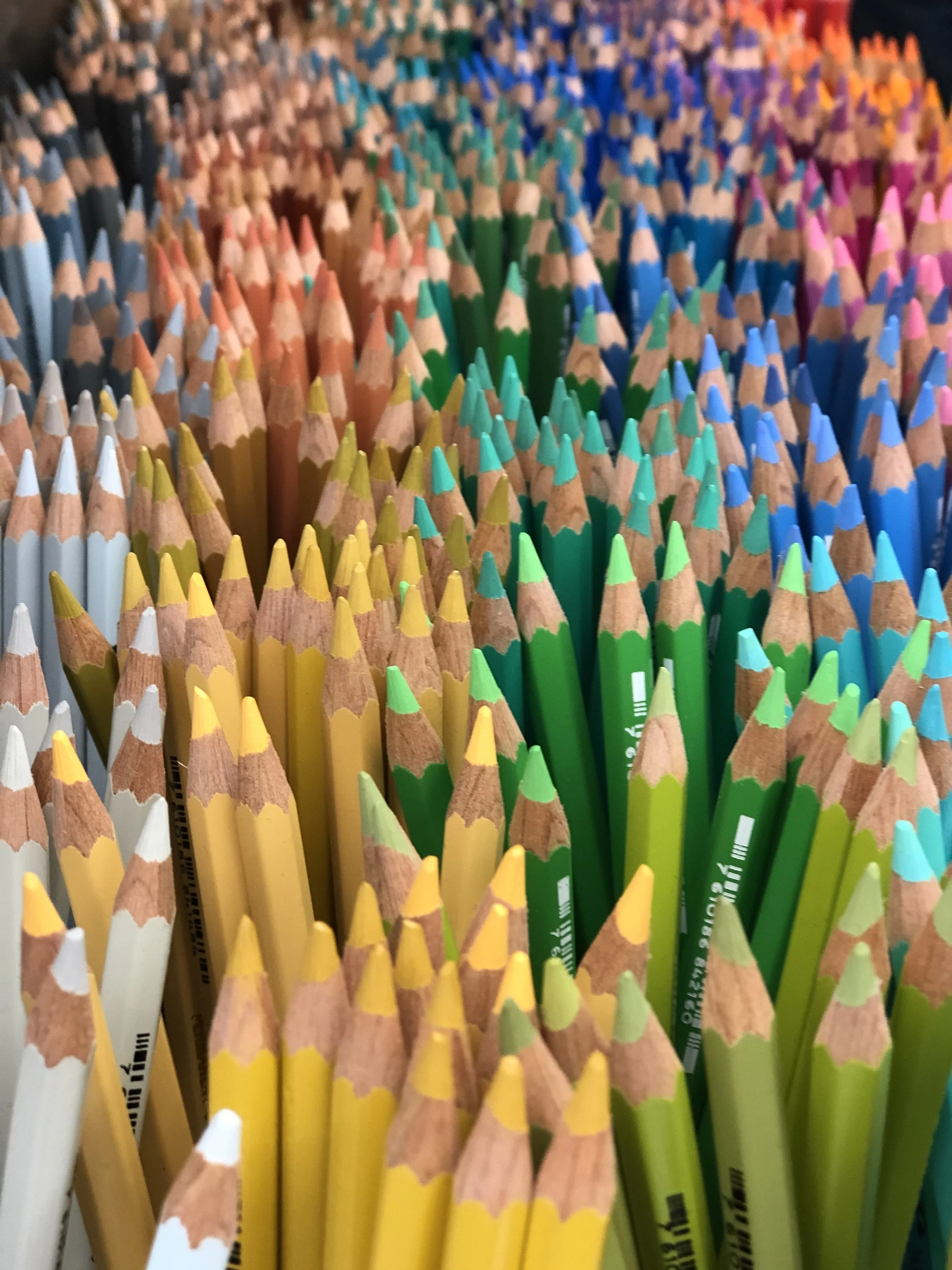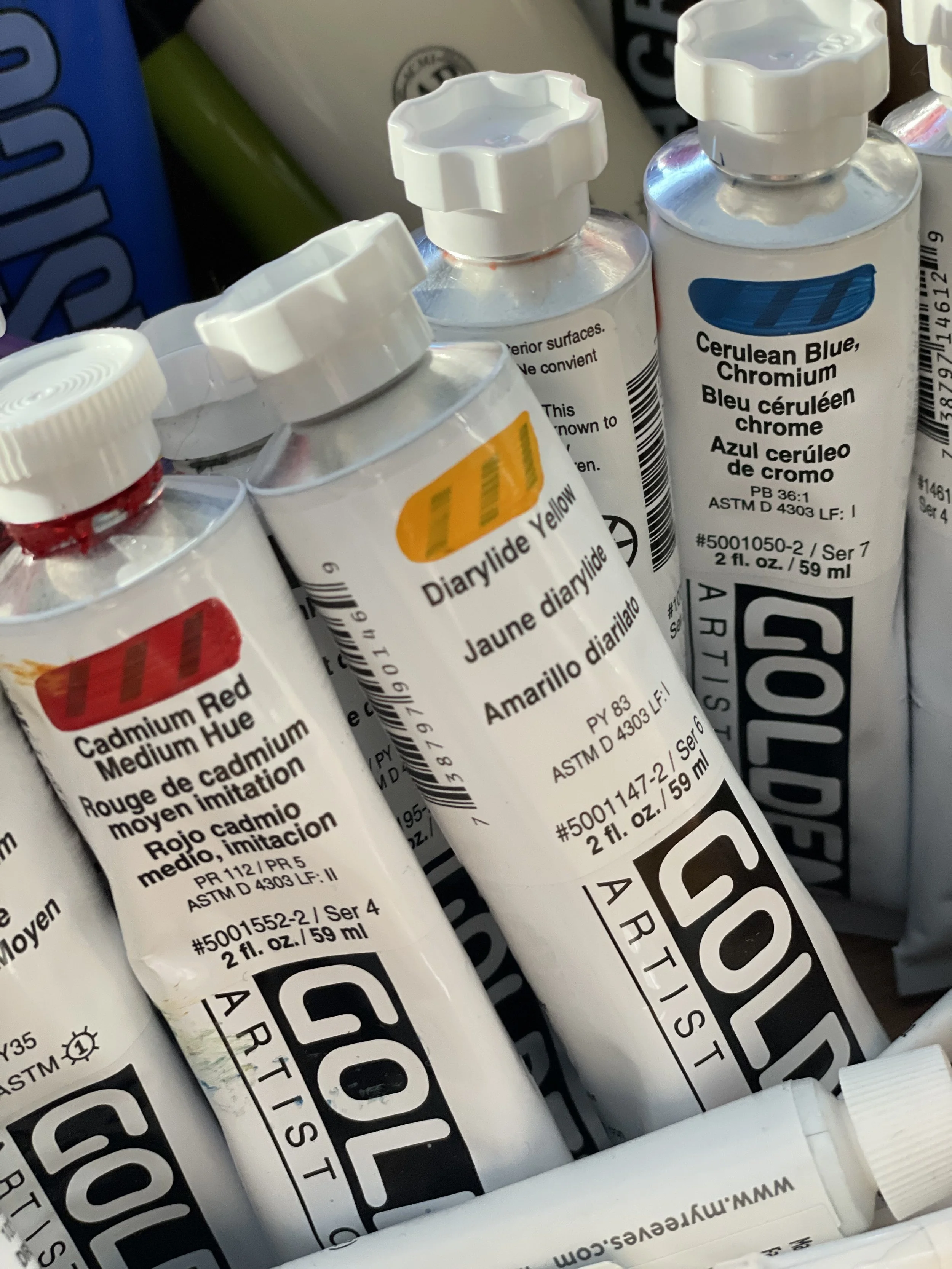 When I start a new painting, I don’t have any idea of what I am going to create. I usually start with some pencil marks letting my feelings of that day lead the way. To keep the momentum going I quickly begin to apply some paint that I’ve pre-mixed and enjoy working with. I create interesting shapes that start to give the panel balance and a very loose direction. These shapes and colors come and go during my sanding and scraping process. I love this stage. It gives me, and my work, energy and excitement. It takes several layers of sanding and repainting to get to a place I love. Sometimes it needs more but I’m not sure where to go with it. The best thing to do at this point is to stop and revisit it in the morning with my coffee, move on to another painting, or take a walk down Millay Road.
