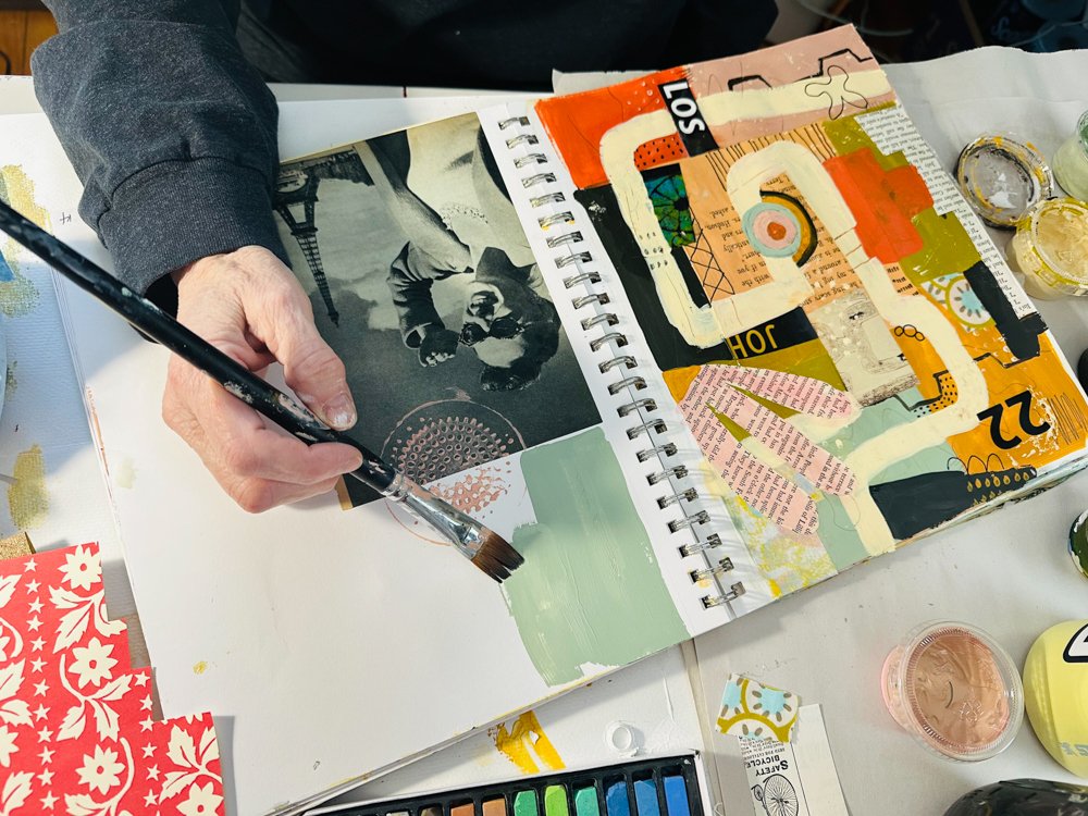 My work is a combination of paint, found paper and type. These elements are a reflection of the years I spent as a graphic designer and quilter. I work for days and sometimes weeks on a painting. It takes many layers to finally see what’s been hiding and developing come to fruition. I love that moment! This is why I paint. For that rush of happiness.